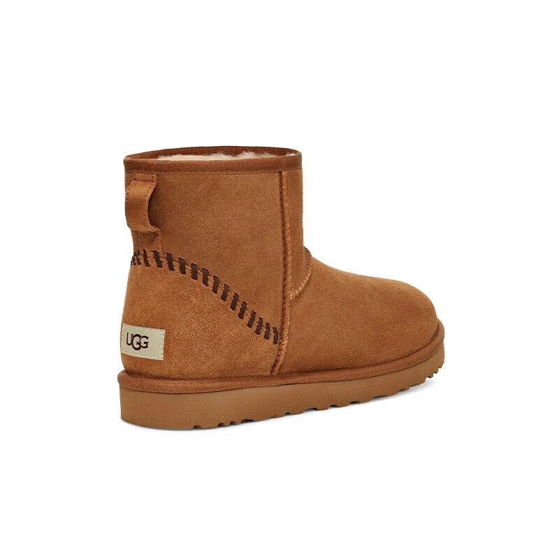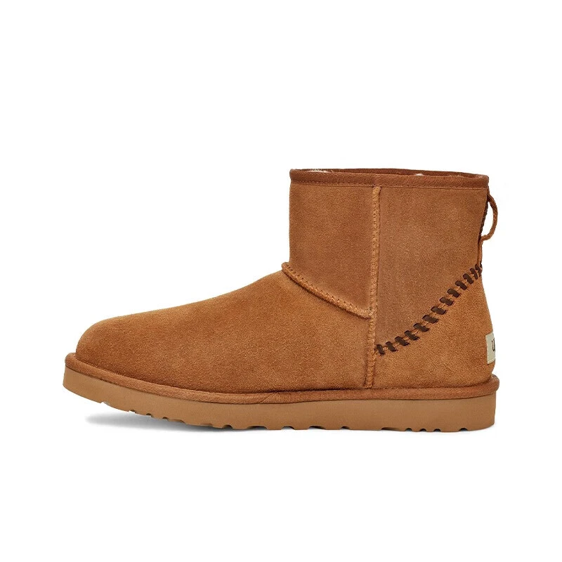 这款短靴采用牛剖层革材质,搭配翻毛皮鞋面,触感柔软细腻,保暖性能极佳。轻翼大底的设计,使得整双鞋轻盈又耐磨,即使长时间穿着也不会感到疲惫。值得一提的是,这款短靴的细节处理相当到位,无论是后拉襻设计还是装饰性缝线,都体现了UGG的匠心工艺。