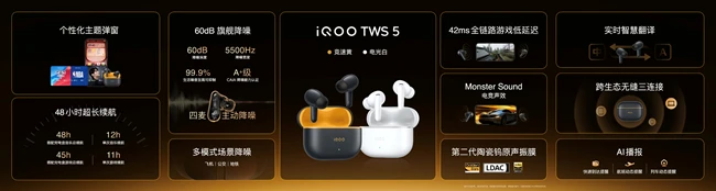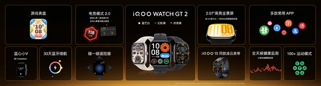 “永劫无间手游和王者荣耀职业联赛双推荐平板”iQOO Pad5e,它搭载第三代骁龙8s、12.1 英寸高清电竞屏、3W+mm² 高效立体散热、10000mAh 大电池,硬实力不虚,游戏超分更是同档断层领先,PC级WPS+ CAJViewer 更是专业生产力升级,学习办公超轻松;iQOO WATCH GT 2 搭载屏占比高达 82.4% 的 2.07 英寸超亮全景屏,局部峰值亮度 2400 尼特,配有 100 多种运动模式,不但可以记录心率、热量等数据,还具备全新电竞模式、接入满血版 DeepSeek 的蓝心小 V 和碰一碰遥控器,33 天超长续航,更是做到全天候健康监测;iQOO TWS 5 全链路游戏延迟低至 42ms,四麦自适应降噪,降噪深度飙至 60dB,拿下 A+ 级 CAIA 降噪能力认证,并有升级的 Monster Sound 电竞声效和 48 小时超长续航,体验更好的跨生态无缝三连接和实时智慧翻译,全新主题弹窗,更有 KPL 电竞选手无畏定制弹窗和定制提示音,是专为游戏玩家打造的旗舰降噪耳机。