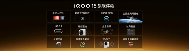 全面无短板,iQOO 15 搭载全新一代超声波 3D 指纹、IP68 & IP69 防尘防水、Wi-Fi7、全功能 NFC、UWB车钥匙、公里级无网通信和红外遥控等,一步到位,全部顶满。