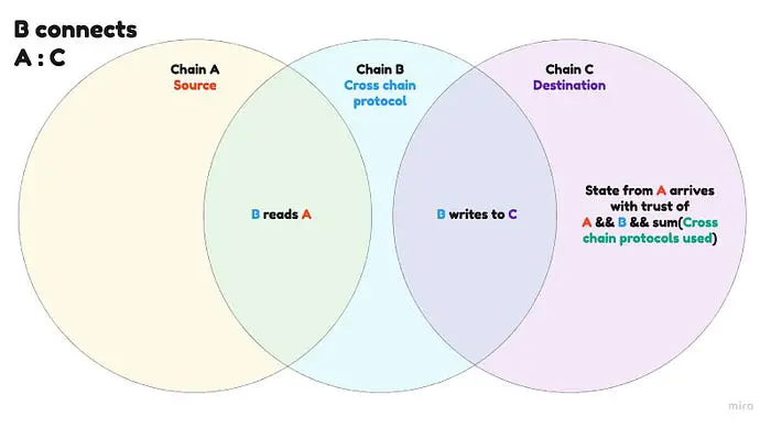 注意跨链通信总是在两个信任环境之间进行。IBC 是两个不相关链信任进行读操作的最佳通用模型,无需中介。如果目标或源无法进行读或写,我们需要引入第三个去中心化协议,可以同时读取 A,向 C 写入。这涉及到两个“跨链”步骤 A:B:C。