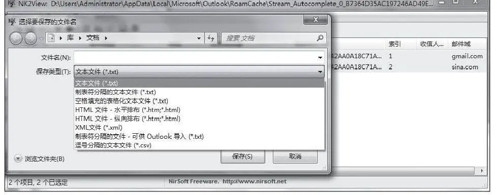 直接访问http://www.nirsoft.net/utils/outlook_nk2_autocomplete.html/,下载NK2View和语言包文件,解压之后即可使用。打开NK2View,它会自动读取Outlook的自动完成文件,并显示所有存储的电子邮件记录,右击选择“保存项目”(如图),即可根据需要将这些记录导出为文本、HTML、XML等格式的文件。