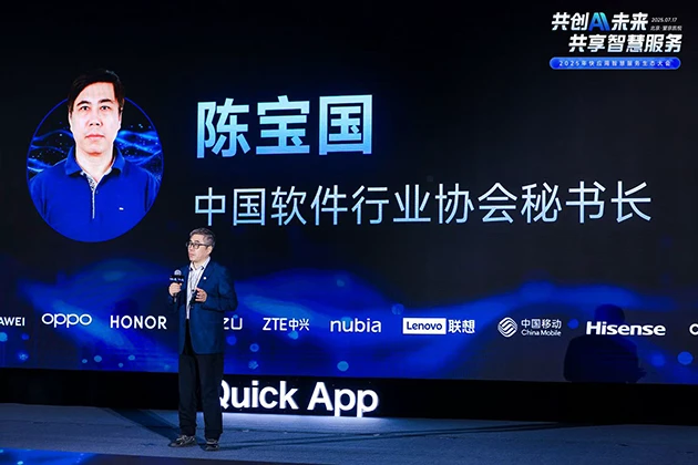 中国软件行业协会常务副秘书长陈宝国先生作大会开幕致辞,陈宝国秘书长指出AI技术正加速推动智能终端成为人机交互核心入口,带动移动服务生态从“流量驱动”向“场景驱动”转型。高度肯定了快应用智慧服务生态在AI赋能背景下展现出的生命力,快应用正迈向“主动服务”新阶段,实现更智能、更精准的服务体验。协会将持续支持快应用标准制定、技术创新与生态协同方面发挥桥梁作用,推动产业开放共赢发展。