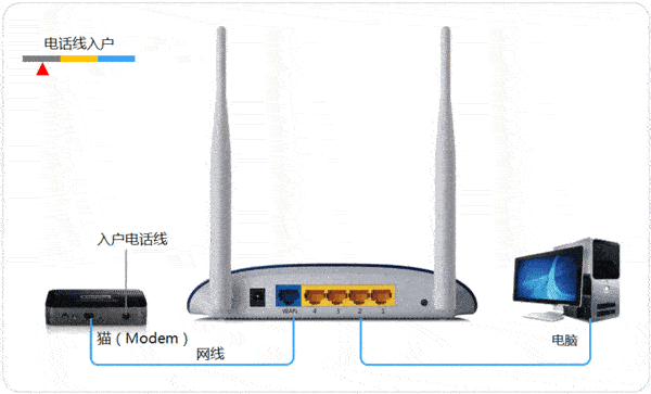 1、有猫(modem):猫(modem)----路由器wan口;路由器lan口----电脑。