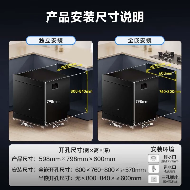老板F80X洗碗机的外观设计简洁大方,黑白双色的经典配色,更显得高雅大气。无论是独立安装还是嵌入式安装,都能与厨房环境完美融合。其尺寸为598mm×798mm×600mm,既不占用过多空间,又能提供充足的清洗容量。顶控设计使得操作更为便捷,无需弯腰,极大地方便了老年人和孕妇的使用。
