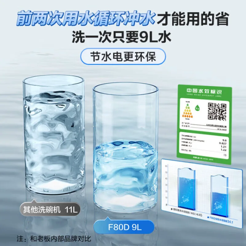 老板F80X洗碗机在节能环保方面表现同样出色。其拥有超一级水效,通过精算能效,在保证强大清洗力的同时,显著降低水电消耗。每次工作周期用水量仅为9L,比传统手洗节省约82%的用水量,同时每次工作周期耗电量为0.872度,比普通洗碗机节省约9%的电量。这样的设计不仅减少了水电费用,还为环保事业贡献了一份力量。每次使用这款洗碗机,我都感到既省钱又环保,非常值得推荐。