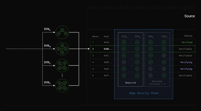 基于 LayerZero 构建的每个应用都可以 配置安全堆栈,该堆栈由多个必需和可选的去中心化验证者网络(DVNs)组成,用于检查发出的 payloadHash 以确保消息完整性,并指定一个可选阈值,用于确定何时可以将消息 nonce 提交为已验证。