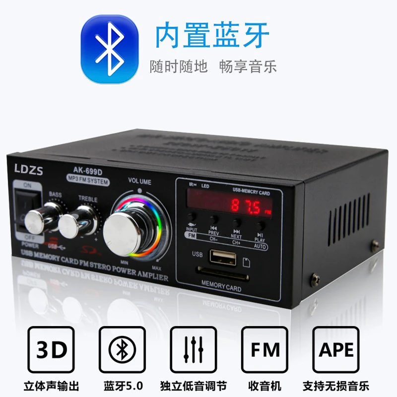 除了音质表现出色外,LDZSAV699功放机在功能方面也十分丰富。它支持多种音频输入方式,包括蓝牙、插卡、U盘等,方便用户随时切换不同的音源。同时,该功放机还具备收音功能,可以收听广播节目,满足用户的多样化需求。此外,它还支持定阻输出,可以连接不同类型的音箱,实现更加灵活的搭配。