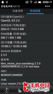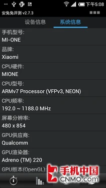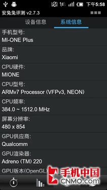 现在我们就一起来看看小米青春版手机在各种评测软件中的表现,首先我们先来看下“青春版”的硬件部分变化。首先它原生了MIUI 4.0.3系统,CPU依然为高通MSM8260,只不过主频变为了1.2GHz,RAM容量也由原来的1GB变为了768MB,除此之外的GPU处理 器、存储空间等均无变化。