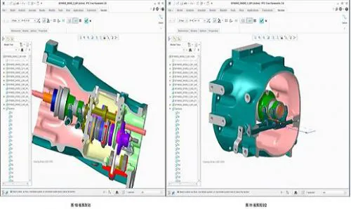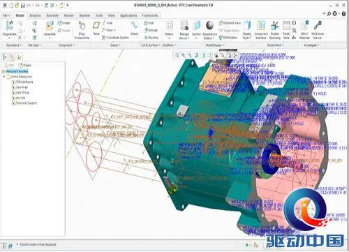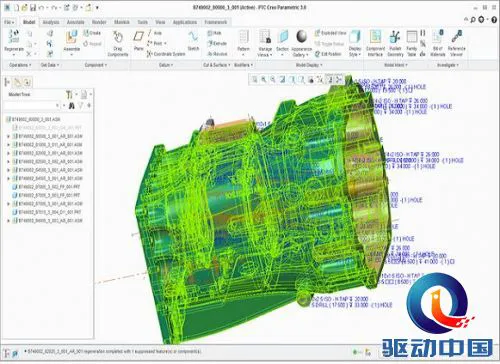 测试模型采用的是2013年由e-works联合PTC举办的PTC Creo应用大赛的一等奖参赛作品的模型,来自五征集团农业装备研究院拖拉机研究所设计的拖拉机传动系统中间箱体的结构模型。山东五征集团前身是成立于1961年的县级拖拉机站,历经近半个世纪的发展,现已形成农用车、汽车和现代农业装备三大主导产业,拥有三大制造事业部,总资产60亿元,员工14000人,是中国机械制造重点骨干企业之一。该模型包含了复杂的设计箱体、轴类、齿轮等零件,包含大量复杂的结构特征,对工作站的性能要求非常高。