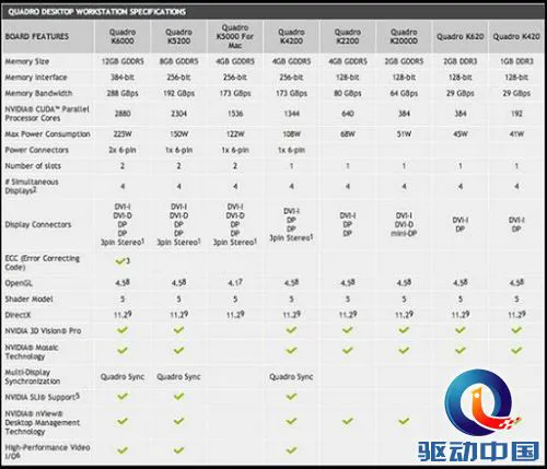 从表1可清楚了解各新发布显卡的详细参数,Quadro K5200是双卡槽版本的专业级Kepler显卡,其配备了2304个CUDA核心、以及8GB的GDDR5显存。该卡需配合PCI-E 3.0 x16总线才能发挥实力,并提供1个DVI-I、1个DVI-D、以及一对DisplayPort 1.2接口。次一级的Quadro K4200则只需占用单个卡槽显卡,其配备了1344个CUDA核心、拥有4GB的GDDR5显存、并且只需一条PCI-E 2.0 x16总线即可满足胃口。端口方面,该卡提供了2个DisplayPort和1个DVI。Quadro K2200是Maxwell架构的显卡,拥有640个CUDA核心,只需PCI-E 2.0总线,同样提供了2个DP和1个DVI输出接口,功耗也从3位数降到了68W。更低一级的Quadro K620则拥有384个CUDA核心(也是Maxwell架构)、以及2GB的DDR3显存、支持PCI-E 2.0总线,提供1个DP和1个DVI输出接口。至于入门级的Quadro K420,该卡拥有192个CUDA核心(Kepler架构)、配备了1GB的DDR3显存、支持PCI-E 2.0总线,同样提供了1个DP和1个DVI视频输出接口。
