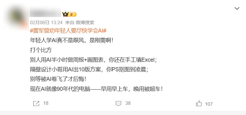 昨天,# 雷军劝年轻人尽快学会 AI # 的话题词冲上热搜,狂揽 1.5 亿的阅读量。