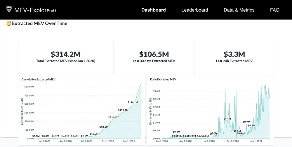 在考虑这些问题的前提下,我们抓取了以太坊,覆盖超过 8 个主要 DeFi 协议及其克隆,自 2020 年 1 月 1 日以来收集了超过 130 万个上链 MEV 交易,以此提供对提取 MEV 的初步下限。我们现在通过 MEV-Explore v0 发布我们的发现:explore.flashbots.net,这是一个公共仪表板,几乎实时跟踪 MEV 的总体指标和以太坊上的最新 MEV 交易。