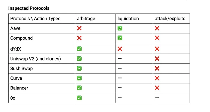 MEV-Explore v0 标志着我们通过 MEV-Inspect 量化和分类 MEV 活动的共同努力的第一个里程碑。目前,支撑这些指标的数据收集检查了下表中列出的 8 个协议(见图 2)。有许多新兴的 DeFi 协议暴露出显著的 MEV 风险(例如 ESD/DSD),以及在最近 DeFi 增长之前大部分 MEV 存在的 OG DeFi 协议(例如 Bancor、Kyber、Etherdelta、Airswap),我们计划将它们涵盖在 MEV-Explore v1 中。此外,我们目前还未覆盖相当大的一部分 MEV 活动,如多交易机会(例如,三明治交易)和 CEX-DEX 价格套利。我们邀请社区参与改进仪表板指标,完善我们的数据收集和清理过程,以及撰写更多 MEV 检查器,以增加 MEV-Explore 的数据覆盖。