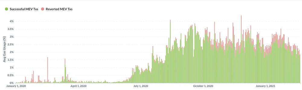 图 3:自 2020 年 1 月 1 日以来,相对于整体网络Gas使用量,可提取 MEV 的Gas使用情况,按成功(绿色)和失败(红色)的 MEV 交易划分