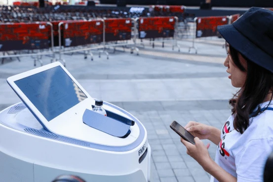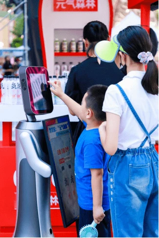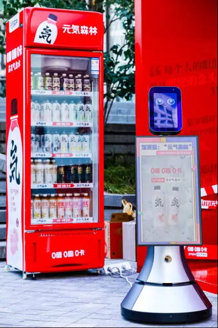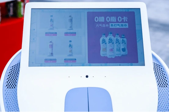 逛累了,口渴了?迎面走来的智能卖货机器人志愿者“豹小贩”带着国潮新饮品——元气森林来了。对它说出自己喜欢的元气森林饮品,确认选择后它就会从仓体里托出饮品,递到你面前,服务十分到位。