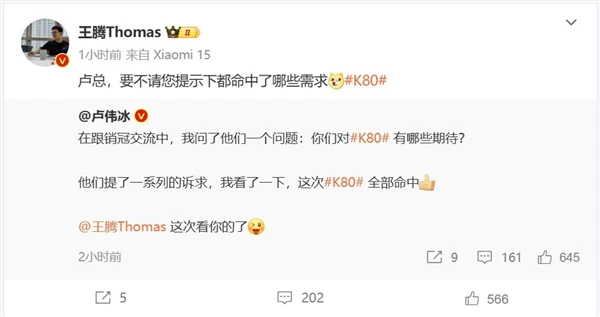 快科技11月16日消息,卢伟冰发微博表示,他问了销冠们一个问题,你们对K80有哪些期待?他们提了一系列的诉求,这次K80全部命中。