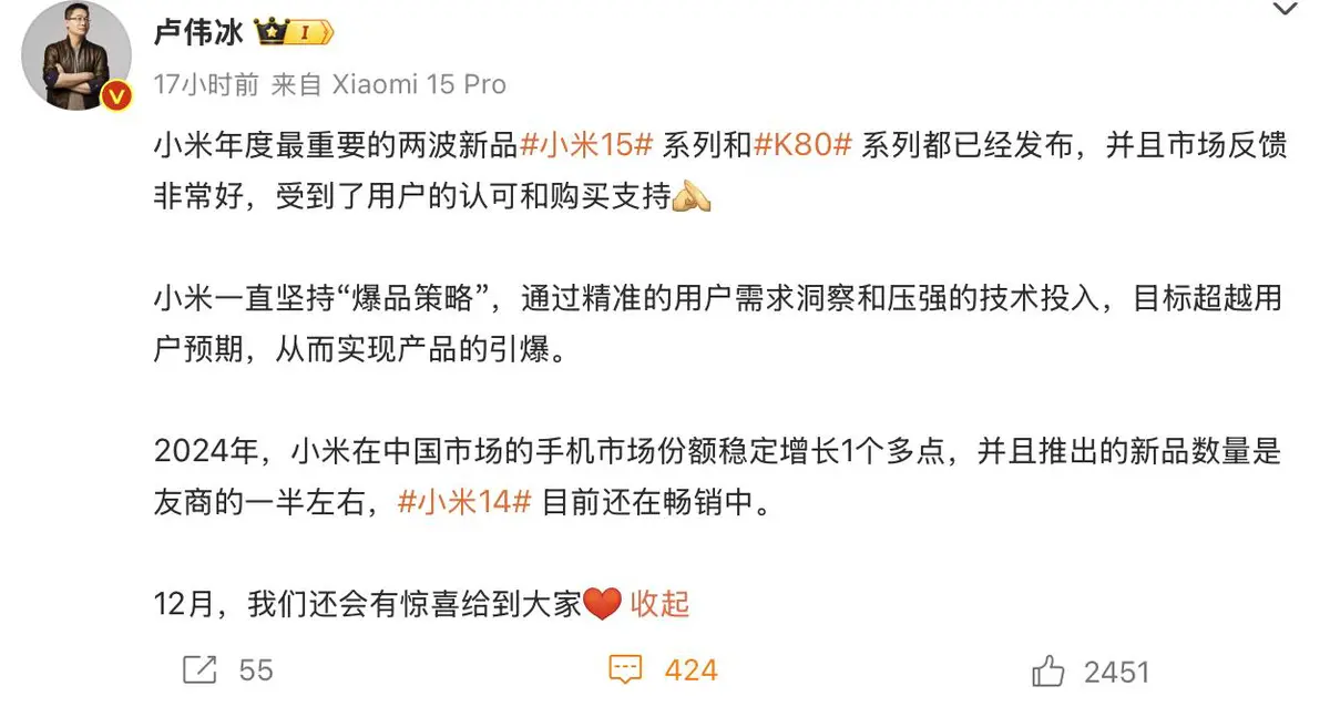 今日,小米集团合伙人、总裁,手机部总裁,小米品牌总经理卢伟冰在社交平台上发文称,小米年度最重要的两款新品小米 15系列和K80系列,市场反馈都很好,受到了用户的认可与支持。