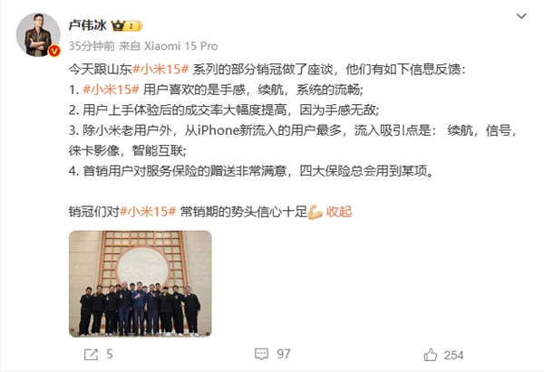 这一反馈来自于山东地区小米15系列的部分销售冠军座谈会上的反馈。