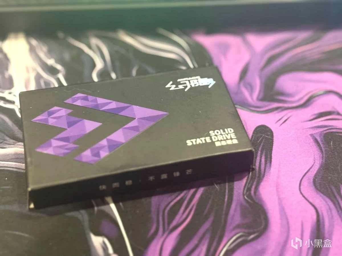 到了我最喜欢的拆箱环节,不过这次的盒子非常小,毕竟只是一张固态而已,外壳是黑色的背景基调搭配着紫色的LOGO,背面则是一个透明的小窗口,可以看到内存条具体长什么样。