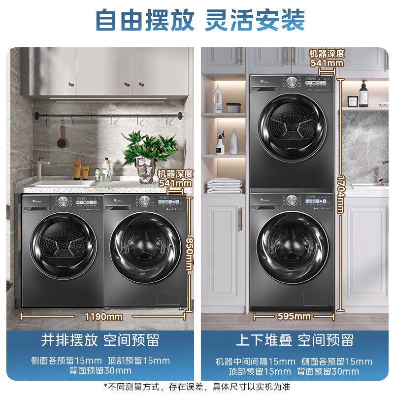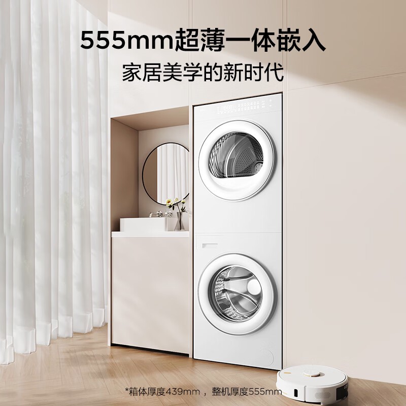 这个洗烘套装还搭载了NTC+MEMS四重变频判干技术,精准控制烘干节奏,衣干即停,省时省电。580mm大筒径,大件衣物也能充分抖散,烘得透,少缠绕。还有智能投放洗涤剂功能,AI智控,用量刚刚好,洗得干净又健康。