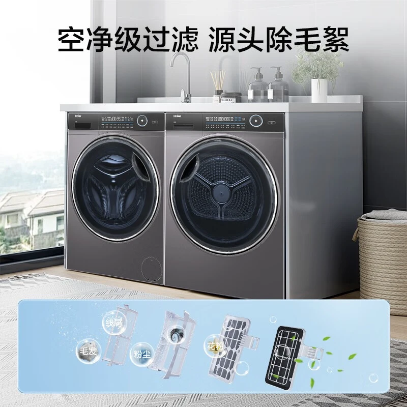 值得一提的是,海尔洗烘套装纤美176+176在细节上也做得非常出色,如四重线屑过滤、USP无间歇速洗等,让我在洗护衣物时更加便捷。总的来说,这款洗烘套装性能强大,操作简便,是家庭洗衣的理想选择。
