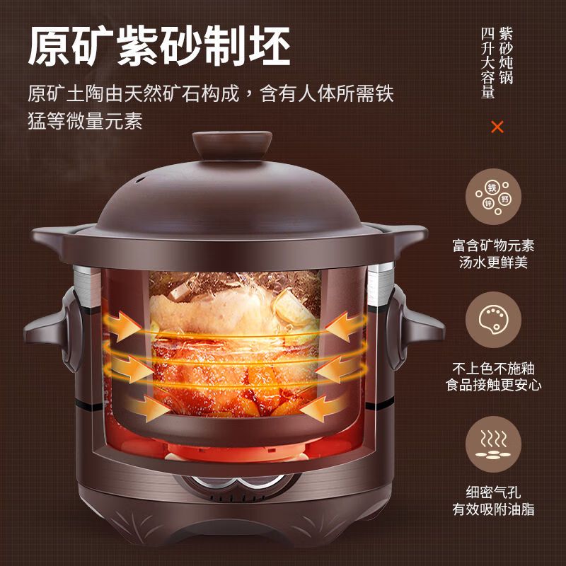 这款电炖锅选用优质原矿紫砂,经过1300℃高温烧制,确保了产品的安全性和无污染。紫砂内胆独有的透气性,能在炖煮过程中改善水的酸碱度,使汤汁更加鲜美。同时,4L的大容量设计,适合家庭聚餐使用,满足了不同人数的需求。