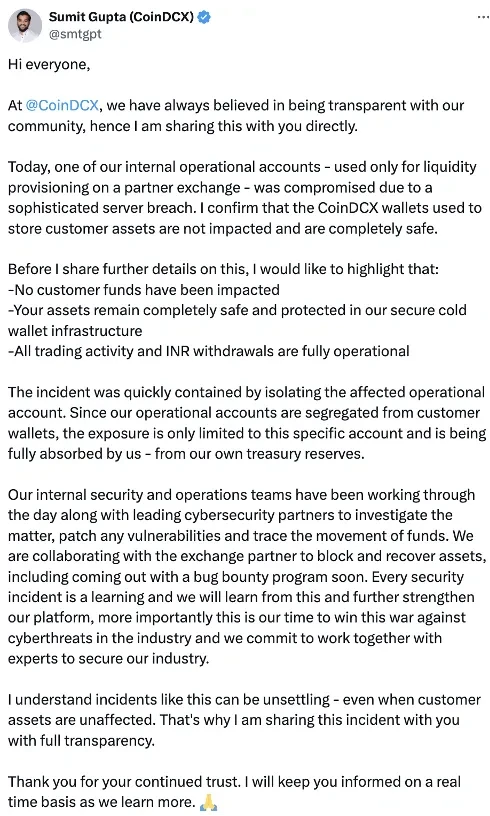 不久之后,CoinDCX 联合创始人 Sumit Gupta 在 X 上回应称,被入侵的钱包是一个仅用于提供流动性的内部运营账户。他强调,客户资金安全地存储在冷钱包中,并未受到影响。交易和提款将很快恢复,攻击造成的所有损失将由 CoinDCX 的储备金承担。