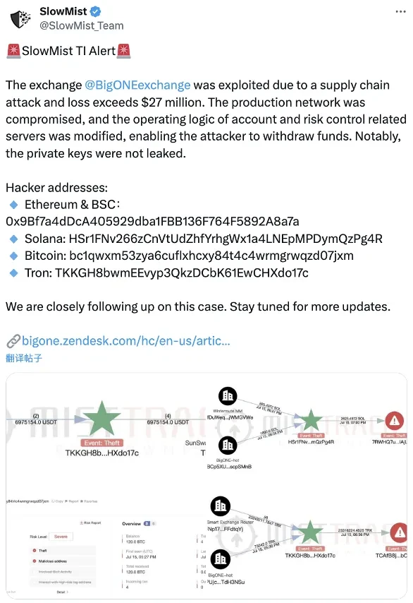 2025 年 7 月 16 日,SlowMist 安全团队检测到加密货币交易所 BigONE 遭受供应链攻击,导致超过 2700 万美元的损失。攻击者入侵了生产网络,并修改了与账户和风险控制相关的服务器逻辑,从而实现了未经授权的资金转移。7 月 24 日,BigONE 在 X 上发布更新称,没有私钥泄露,所有损失将由平台全额承担。