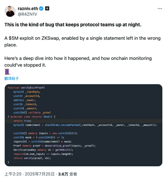 2025 年 7 月 9 日,以太坊 Layer 1 跨链桥 ZKSwap 遭受漏洞利用,导致约 500 万美元的损失。攻击者利用了该桥的紧急提款机制。分析表明,负责验证零知识证明的机制未能执行实际验证。这一严重疏忽使攻击者能够伪造提款证明并绕过该桥的核心安全机制。