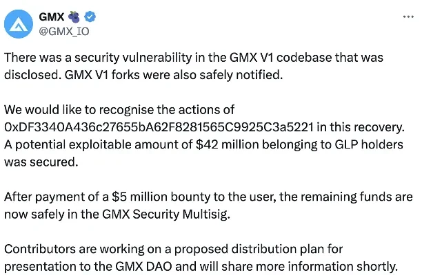 7 月 11 日,GMX 在 X 上发布声明,确认该事件源于 GMX V1 代码库中的一个漏洞。该漏洞现已披露并已通知所有 GMX V1 分叉。GMX 还向帮助解决该问题的白帽黑客奖励了 500 万美元的赏金。攻击涉及的 4200 万美元已成功得到保护。