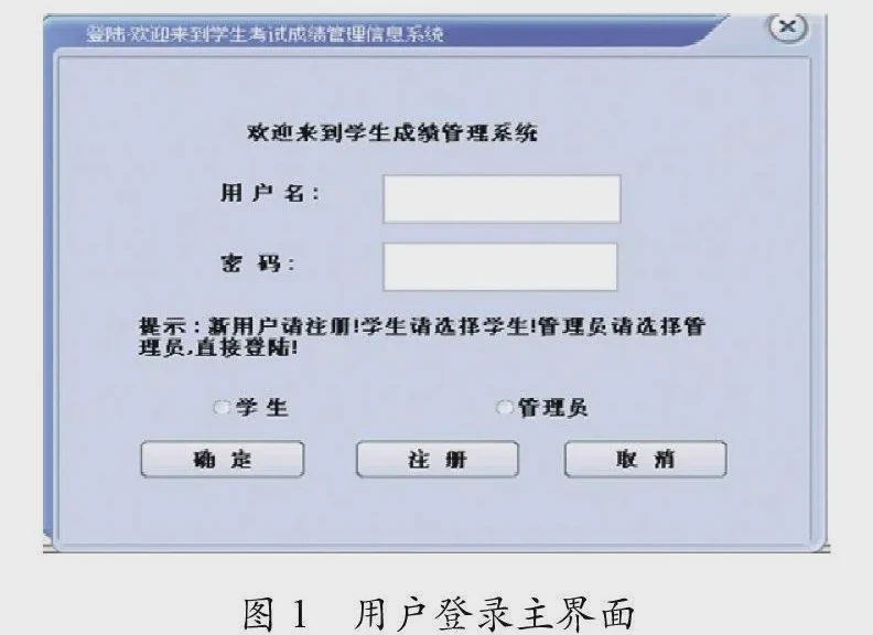 首先是进入登录界面,本界面显示系统名称,密码校验等信息,本系统的用户分为两类:管理员,学生。使用者可以在组合框中选择所要登录的用户的类型,并输入相应的用户名和密码,单击确定就会将输入提交给系统以验证用户、密码及身份。如果用户类型及密码正确,就会进入与用户相对应的界面如图1所示。