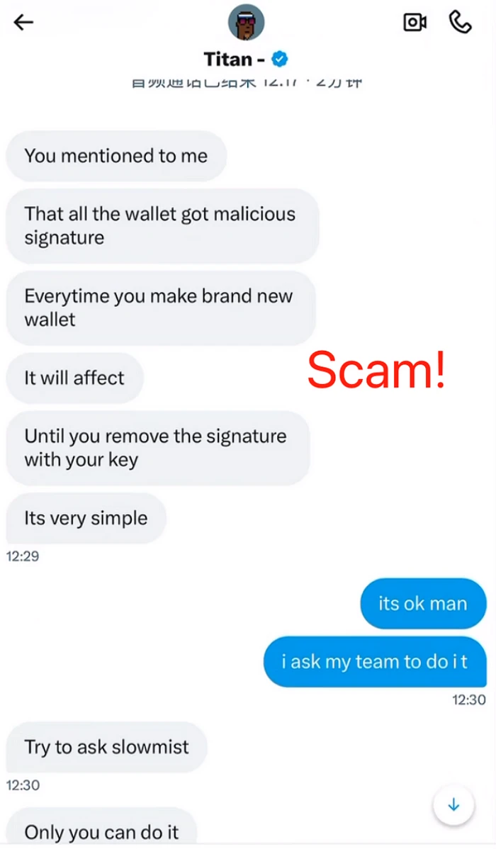 尽管用户开始感到不安并停止合作,但诈骗者并没有放弃。为了建立可信度,他们甚至建议用户通过慢雾安全团队验证风险。对于不太懂安全知识的用户来说,诈骗者“愿意”咨询一家知名的安全公司这一事实,可能会产生一种虚假的信任感。诈骗者甚至在对话中直接提到了 @SlowMist_Team,试图将自己与慢雾错误地联系起来。