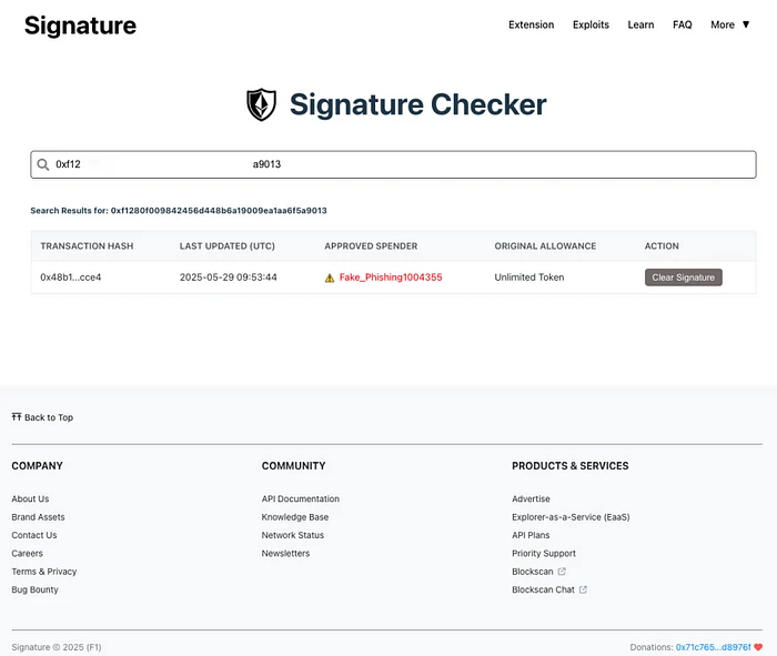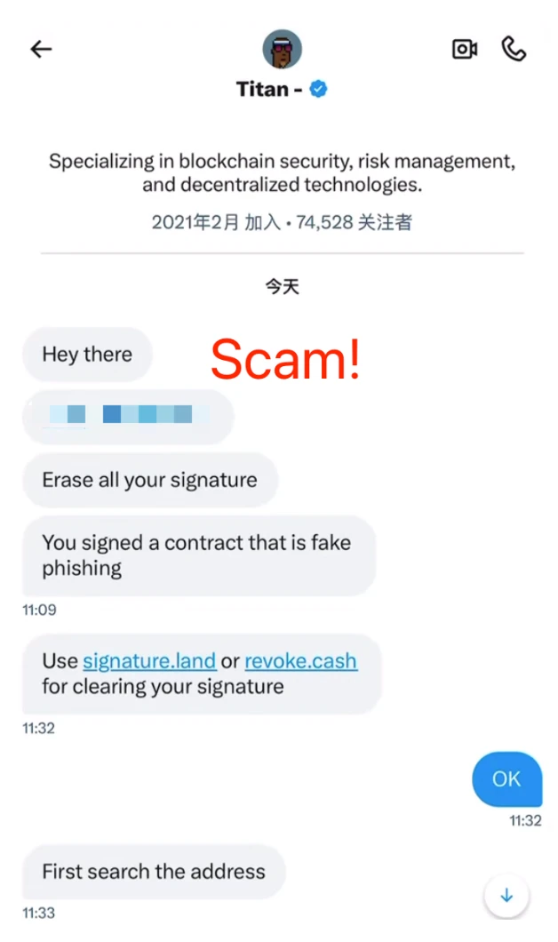 至此,诈骗非常清楚了。根据用户所述,诈骗者首先通过 X(以前的 Twitter)上的回复和私信联系他们,声称:“You signed a phishing signature(你签署了一个钓鱼签名)”,然后提供了一个“撤销工具”的链接。