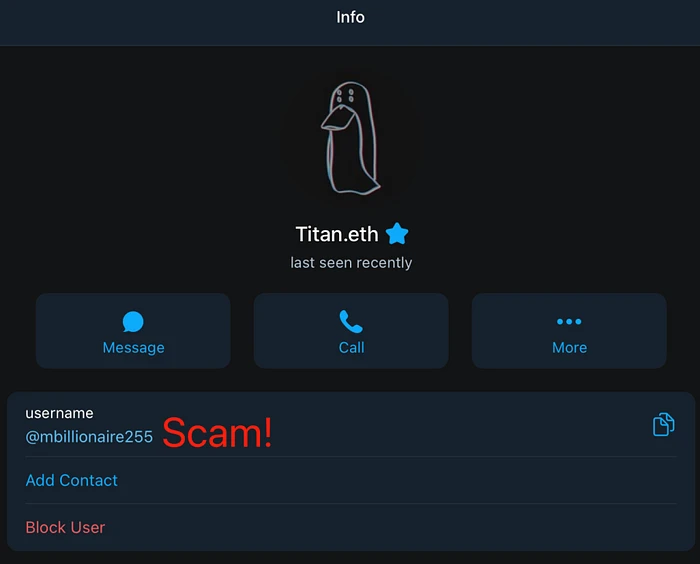 进一步调查显示,诈骗者还通过在 Telegram 上使用 ZachXBT(一位知名的链上侦探)的头像来冒充他。