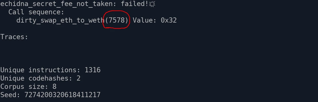 Echidna 的目标是找出破坏不变的秘密值 这里,该不变式函数仅在费用为零时返回 true。在这里,秘密的搜索被简化,但在现实场景中,这个过程可以包括费用和奖励的计算。当算法错误地计算费用/奖励,可能影响用户或协议的回报时,Echidna 可以帮助发现边缘情况。