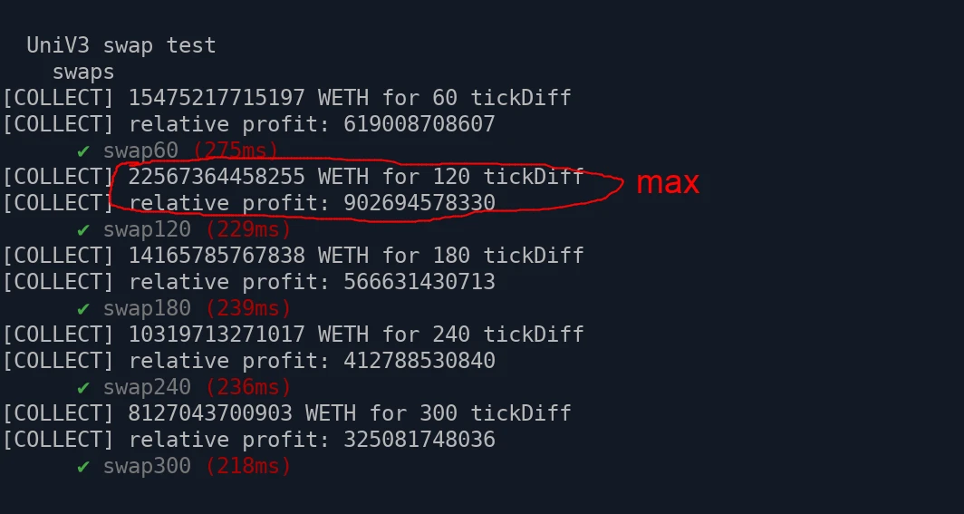 在测试中,我们计算我们在池的流动性中放置了多少 WETH。随后在 collect_rewards() 中,我们计算所获 WETH 费用与放入池中的 WETH 之间的关系。这帮助我们识别最有利的 ticks 范围。
