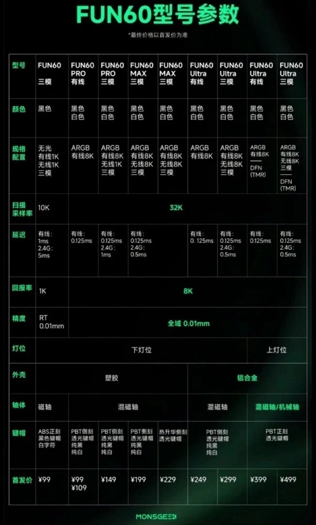 魔极客FUN60来了,虽然现在各家都推出了百元磁轴键盘,99的磁轴键盘不足为奇,甚至还有79的。但是99的三模磁轴应该是第一把了吧,大几百上千的磁轴好像也基本没有做三模的。具体无线连接下键盘表现怎么样,还是得观望一下