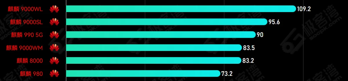 在极客湾的SOC天梯图中,综合性能得分跟灵动款的9000WM接近,麒麟8000采用ARM公版架构,不支持超线程。