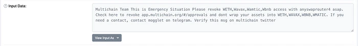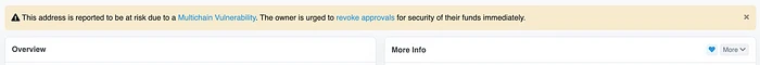 2022 年 1 月 10 日,我们收到了来自 Dedaub 的警报,提示 Multichain 流动性池合约和路由合约存在两个严重漏洞,后来证实影响了八种代币(WETH、WBNB、MATIC、AVAX、MFI、WSPP、TLOS、IOTEX)。 在报告后不久,流动性池的漏洞得到了修复,因为我们将受影响的代币流动性升级到了新的合约。 然而,尚未撤销受影响的路由合约授权的用户仍然面临风险。 重要的是,用户自己必须撤销授权。 因此,我们在 1 月 18 日发布了关于此漏洞的正式公告,并敦促用户立即按照说明采取行动。