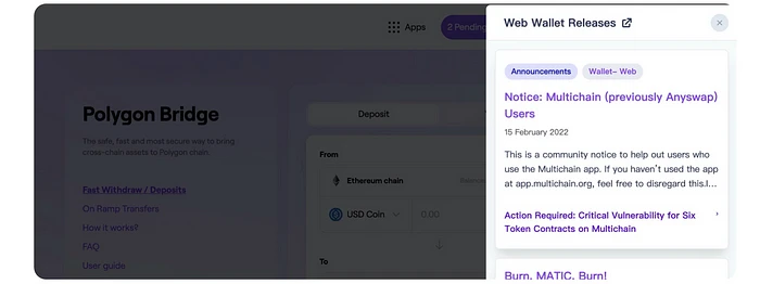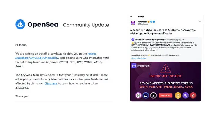 1 月 18 日: 我们发布了一份警报公告,敦促受影响的用户撤销授权。 同时,Multichain 迅速采取措施,通过不断向所有用户发布更新,并通过联系所有可能的渠道(Opensea、MetaMask、Polygon Bridge、Dapps 等)创建警报并呼吁用户立即采取行动,从而最大限度地提高用户撤销授权的比例。