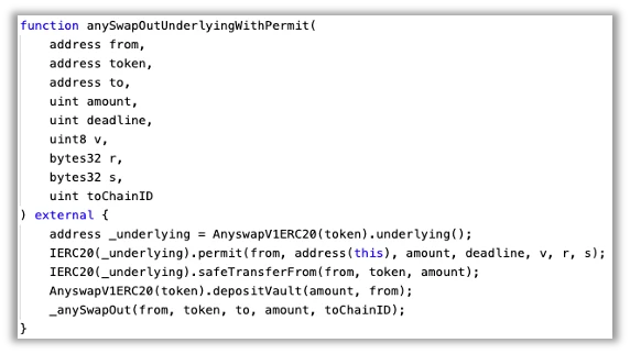 黑客部署攻击合约,并将受影响的代币合约地址设置为其底层代币参数。 然后,他们可以通过调用 anySwapOutUnderlyingWithPermit 到 AnyswapRouter 合约来窃取用户资金。