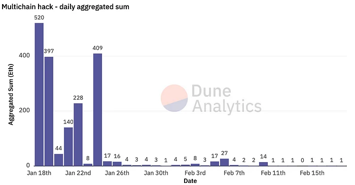 在发布警报公告 16 小时后,发生了第一次漏洞利用。 Multichain 和安全公司 Dedaub 立即加入了对抗黑客的战斗,通过运行白帽机器人来营救用户。