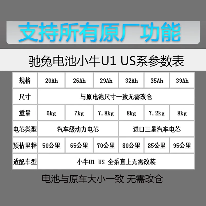 在电池容量方面,驰兔小牛电池提供了20Ah、26Ah、29Ah、32Ah、35Ah和39Ah等多种规格,以满足不同车型和续航需求。其尺寸与原电池尺寸一致,无需改仓,方便用户更换。