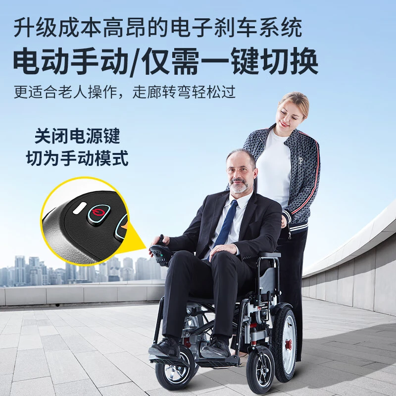 这轮椅,还采用了智能电磁刹车,上下坡更安全,稳字当头,保障老人安全。400瓦大功率电机,动力强,上坡有劲,300瓦电机动力太弱,爬坡没劲,500瓦电机重量太重,不方便,这400瓦电机,简直就是轻便轮椅中的佼佼者。