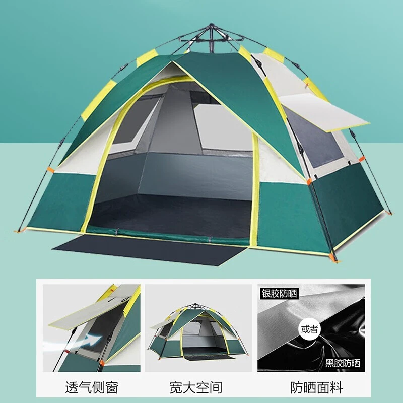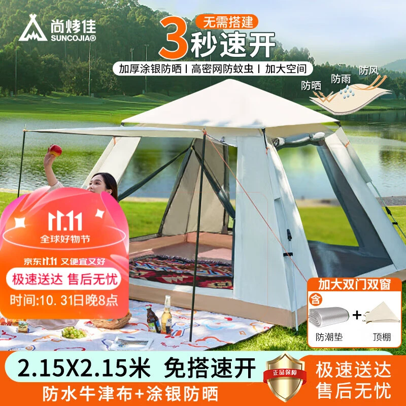 尚烤佳Suncojia全自动露营帐篷,采用150D防晒涂银面料,内里涂银,具备优异的防晒防泼水功能,满足短暂防雨需求。帐篷展开尺寸为215X215X高142cm,宽敞舒适,可容纳一家人休息。净重3.6KG,便携收纳,轻松携带。独特弹压式自动帐架,3秒速开,方便快捷。大门窗搭配细密网纱,通风透气,有效防止蚊虫侵扰。