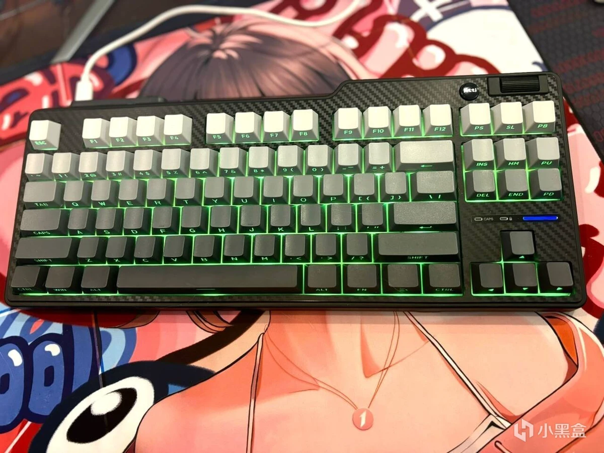 正面87配列去除了小键盘区域,该有的功能键和F区域都有保留,而且上面还有一层防碳纤维纹理上盖,手感和质感都非常不错,右上角为开机键以及一个金属滚轮,实用性也是拉满了。