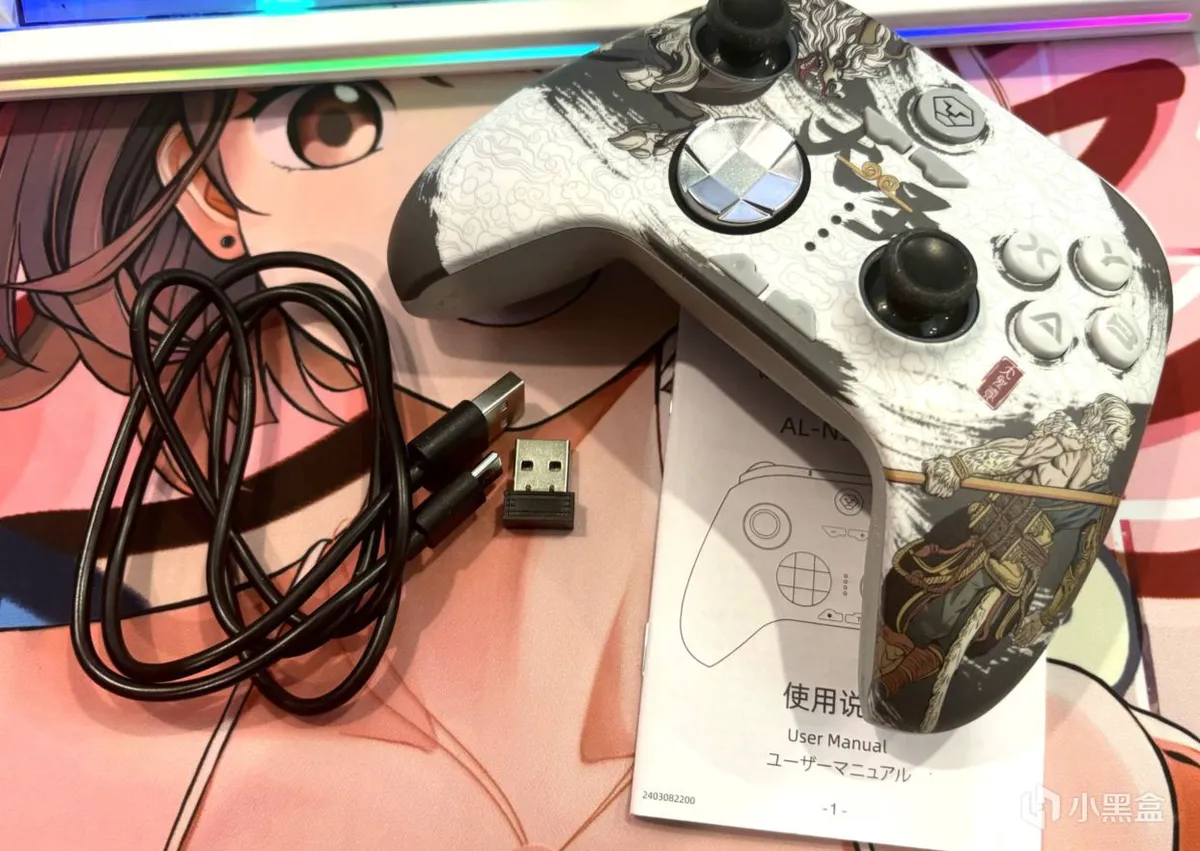 打开之后里面包含的东西并不算多,就是标准的手柄,使用说明书以及接收器数据线这些,不过让我感到惊喜的是,它的外观是真的帅啊,右下角的猴子和左上角的龙进行对视,中间写着大圣二字,上面还套着一个金箍,你小子是真的把联名元素拉满啦,不过让我看看具体配置怎么样吧。