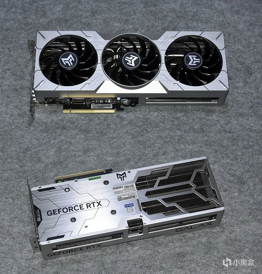 这套散热系统影驰叫它:寒光星,采用纯铜均热板+8根6mm镀镍符合热管的散热方案,热量吸收充分后,能迅速引导出热量通过3个92mm静霜风扇排出。正面金属面板采用压铸工艺,包边处采用CNC工艺处理高光两边熠熠生辉。