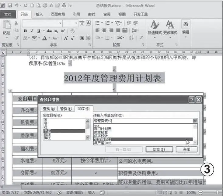 此外,以后要在文档中找这些内容时还可以通过书签快速定位。你只要单击Word窗口左下角的“页面:X/XX”或按“Ctrl+G”组合键,打开“查找和替换”窗口的“定位”界面。在“定位目标”列表中选择“书签”,从“输入书签名称”的下拉列表中选择“管理费表12”(如图3),或直接输入书签名,单击“定位”按钮即可快速定位到 “2012年度管理费用计划表”中查看。