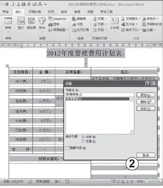 在Word 2010中使用书签来进行标记既简单又实用。比如想用“2012年度财务管理计划书.DOCX”中的“2012年度管理费用计划表”,那么在打开“2012年度财务管理计划书.DOCX”查看时,就要选中整个“2012年度管理费用计划表”和表格标题等想引用的内容。切换到“插入”选项卡单击“书签”,在“书签”窗口中输入书签名为“管理费表12”,单击“添加”按钮创建一个“管理费表12”书签(如图2)。在此,书签名绝对不能以阿拉伯数字开头,否则“添加”按钮会变成灰色无法添加。照这样对那些准备用到的文本、数据、表格内容逐一用书签进行命名。在写总结时就可以不用打开参考文档,直接通过书签引用所需内容了。
